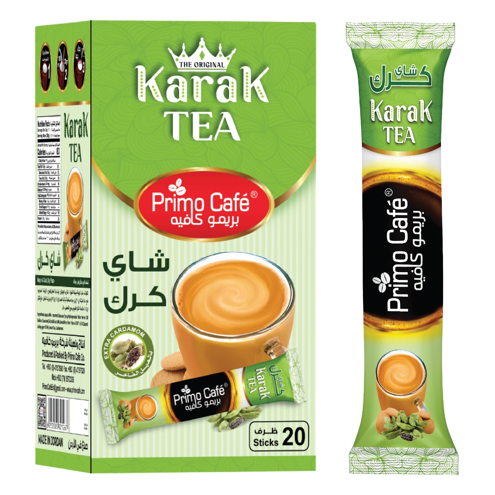 Primo Café Karak Tea – Original Blend brings you the rich and comforting flavor of traditional Middle Eastern karak tea in a convenient instant form. Carefully crafted with high‑quality ingredients and extra cardamom, this blend offers a smooth, creamy texture and a bold aroma that karak tea lovers appreciate.
